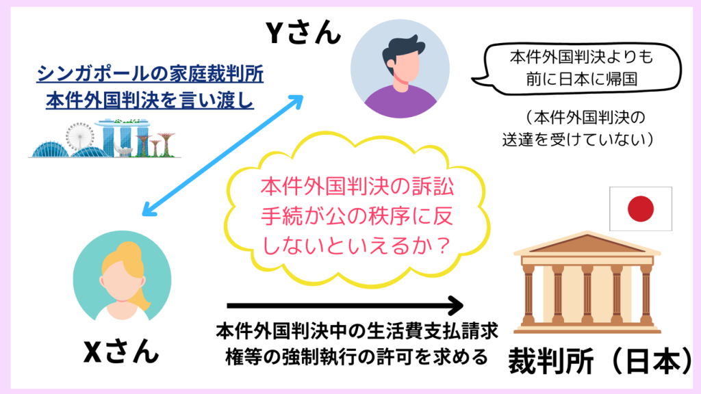 そこで、Xさんは、シンガポールの家庭裁判所が言い渡した本件外国判決のうち、YがXさんに対してC2及びC3の生活費として月額合計5000シンガポールドルを支払うよう命ずる部分について、民事執行法24条に規定する執行判決を求める裁判を申し立てました。