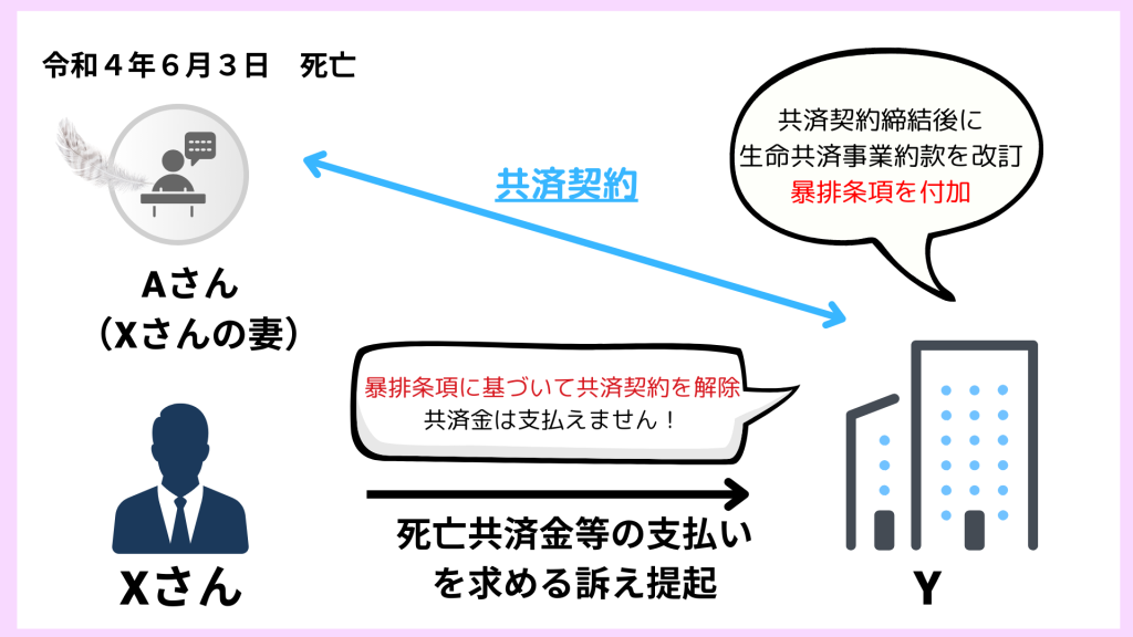 この事案は、暴力団構成員であるXさんの配偶者(妻)Aさんが、生命共済契約を締結していたところ、Aさんが死亡したとして、Yに対し、死亡共済金の支払いなどを求めた事案です。