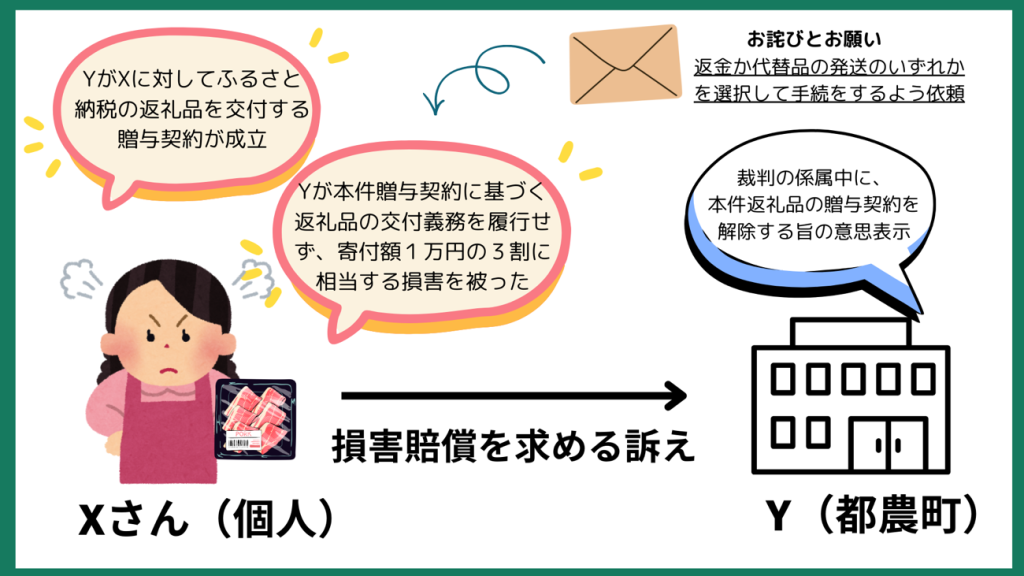その後、Xさんは、Yに対して、XとYとの間には、YがXに対してふるさと納税の返礼品を交付する贈与契約が成立しており、Yが本件贈与契約に基づく返礼品の交付義務を履行しないため、Xは寄付額1万円の3割に相当する3000円の損害を被ったと主張して、損害賠償を求める訴えを提起しました。