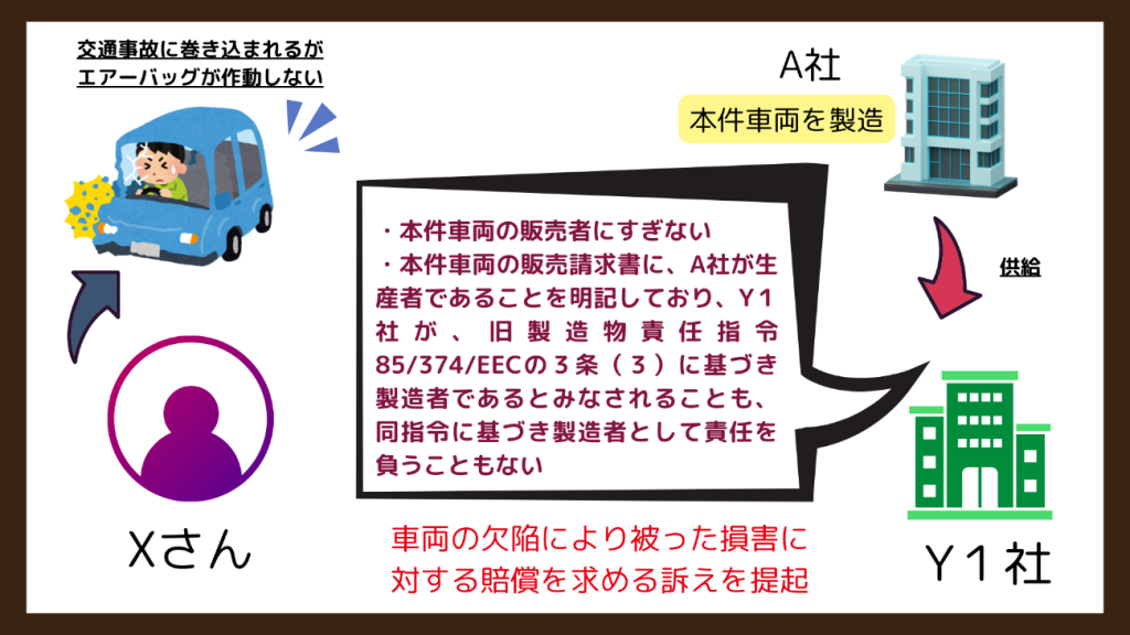 この訴訟において、Y1社は、自己は本件車両の販売者にすぎないと主張していました。また、Y1社は、本件車両の販売請求書に、A社が生産者であることを明記しており、Y1社が、旧製造物責任指令85/374/EECの3条(3)に基づき製造者であるとみなされることも、同指令に基づき製造者として責任を負うこともないと主張していました。