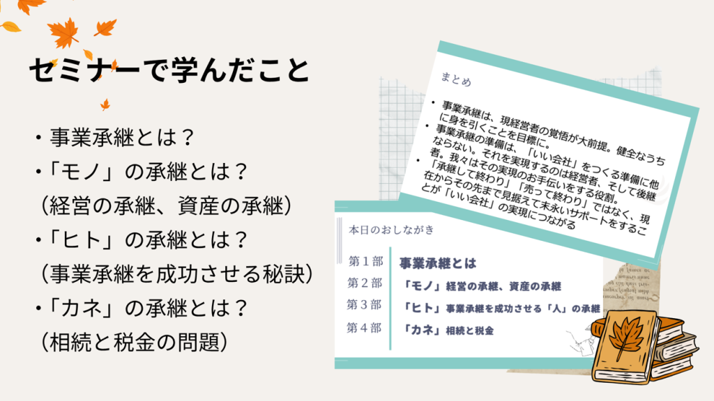 本セミナーでは、大切な会社の未来のために今から何ができるのか、何をしなくてはならないのか、そもそも事業承継とはどのようなものなのかなど、事業承継の基礎から少し応用的な部分まで幅広くお話をさせていただきました。
