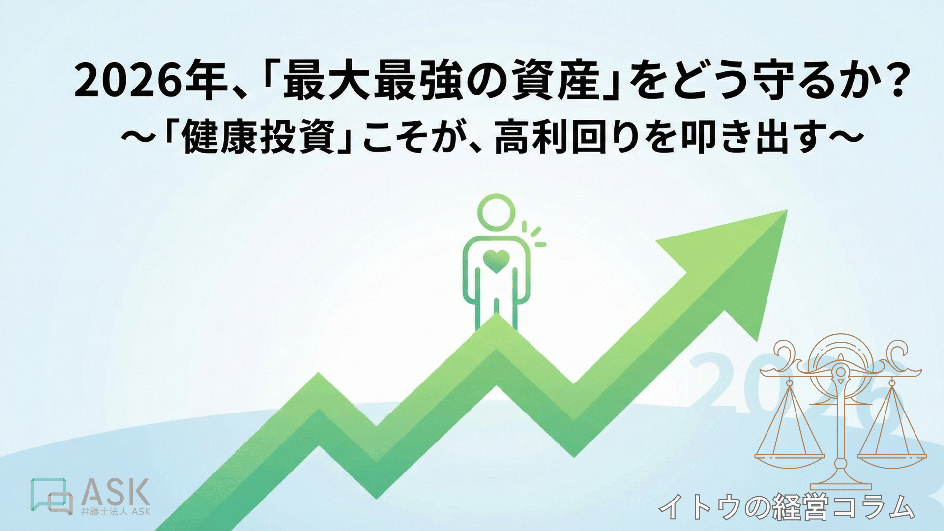 昨年来、私は専門家として様々な法律問題の解決にあたり、また多くの会社経営者の方々と対話を重ねてまいりました。その中で、改めてその重みを痛感しているのが「健康」という名の無形資産の重要性です。