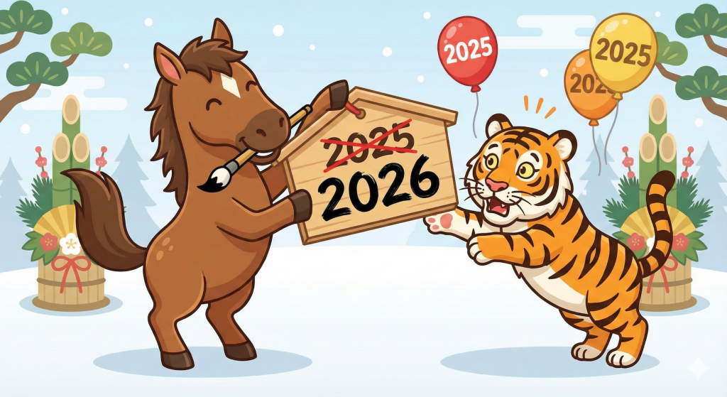 このイラストのように、AIが提示した「2025」の惰性を、人間が意思を持って「2026」へと書き換えていく。そんな姿勢こそが、法的リスクを回避し、同時にオリジナリティのある年賀状を作る秘訣と言えるでしょう。