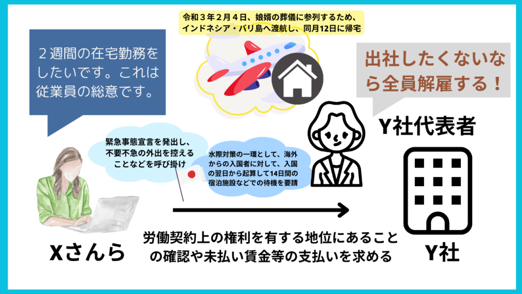 「(…)Xらを含むY社の従業員は、新型コロナウイルスの感染拡大を防ぐ行動が求められている当時の社会情勢を前提に、Y社代表者の帰国後2週間は全従業員が在宅勤務をするという方針を立て、X1が、この方針をY社代表者に伝えたものである。そして、当時の社会情勢のほか、インドネシアでも相当数の感染者が存在し(…)、Xらを含むY社の従業員において、Y社代表者が新型コロナウイルスに感染している可能性があるのではないかと懸念を抱くこと(…)もやむを得ない状況にあったといえること、PCR検査の精度には限界があり(…)、陰性の検査結果が出ても、新型コロナウイルスに感染している可能性を否定できるものではないことからすれば、X1を含むY社の従業員において、Y社代表者が新型コロナウイルスに感染している可能性があることを前提とした行動をとることには合理的な理由が存在したというべきであるから、これをもってY社代表者を侮辱したとか、職場の秩序を乱したものと評価することはできない。