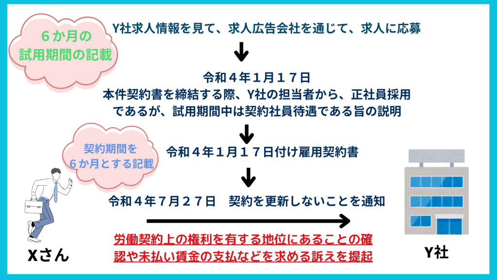 令和4年1月17日、Xさんは、本件契約書を締結する際、Y社の担当者のIさんから、正社員採用であるが、試用期間中は契約社員待遇である旨の説明を受けました。