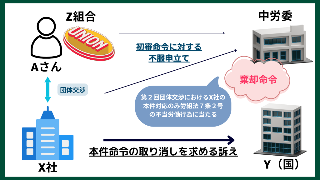 この事案は、Z組合らによる救済の申立てを受けて東京都労働委員会がした初審命令へのX社らによる再審査の申立てに対して、中央労働委員会が行なった再審査の命令について、X社がその一部の取消しを求めた事案です。