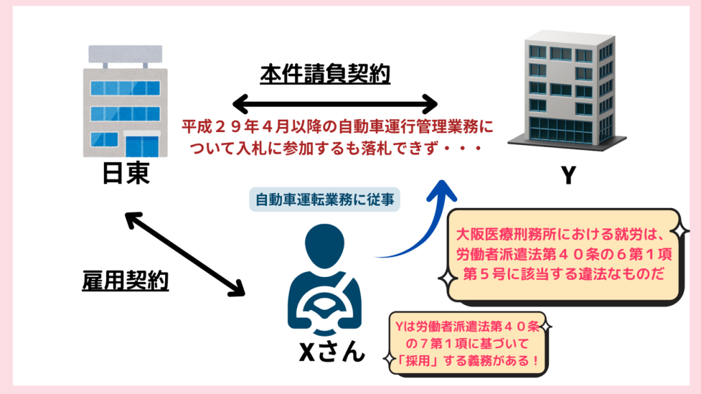 この事案は、大阪医療刑務所長から自動車運行管理業務を請け負った日東カストディアル・サービス(株)との間で雇用契約を締結し、同社が請負契約を締結した大阪医療刑務所において自動車運転業務に従事していたXさんが、Xさんの大阪医療刑務所における就労は、労働者派遣法第40条の6第1項第5号に該当する違法なものであると主張して、国(Y)に対して、