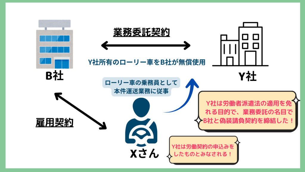 そして、Xさんらは、Y社が労働者派遣法の適用を免れる目的で、業務委託の名目でB社との間で偽装請負契約を締結し、労働者派遣の役務の提供を受けていたから、労働者派遣法第40条の6第1項第5号に基づいて、Xさんに対して労働契約の申込みをしたものとみなされ、Xさんらはこれに対して承諾の意思表示をしたと主張し、Y社に対して、労働契約上の権利を有する地位にあることの確認を求める訴えを提起しました。