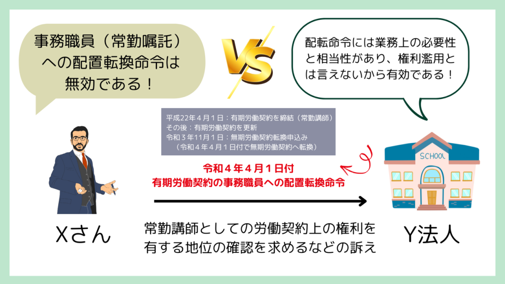 この事案は、常勤講師としてY法人に雇用されていたXさんが、令和4年4月1日付で有期労働契約の事務職員(常勤嘱託)への配置転換命令を受けたことから、配転命令が無効であると主張して、Y法人に対し、常勤講師としての労働契約上の権利を有する地位の確認を求めるなどした事案です。