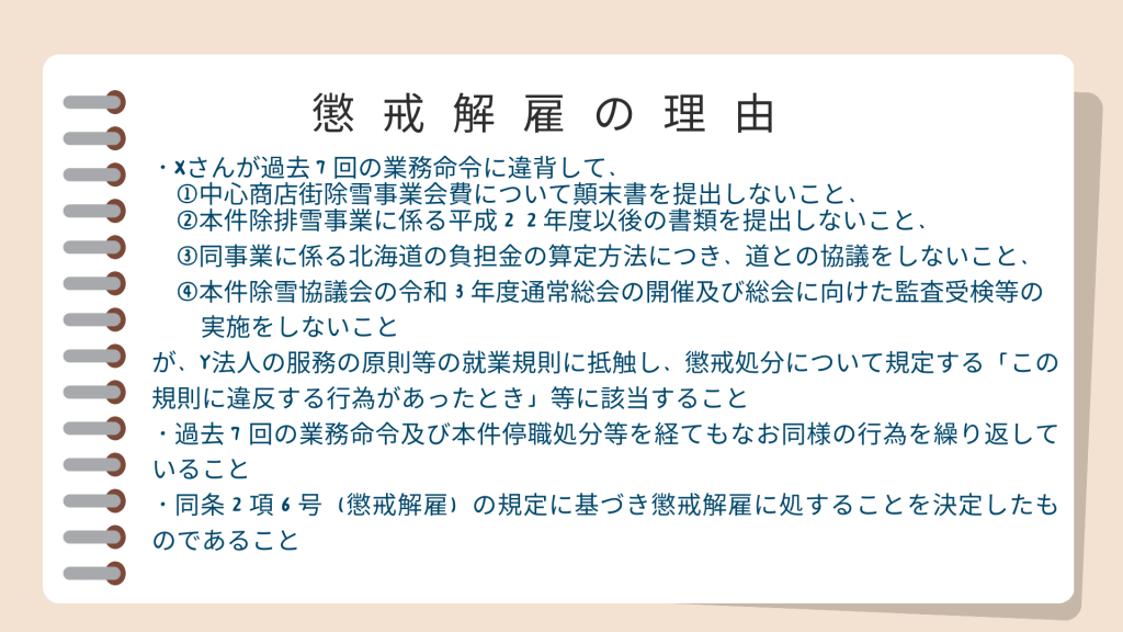 「Xさんは、本件除雪協議会に係る業務につき、口頭及び業務命令による多数回の指示等が繰り返されていただけでなく、懲戒処分として実質的な不利益を課された本件停職処分を経ても、なお同種同様の業務命令違反と怠業を続けていた。Y法人の就業規則(30条1項)では、服務の原則として、上司の指揮命令に従い、その職務に精勤しなければならないことなどが定められているところ、本件懲戒解雇の事由として挙げられた前記①から④の業務に関し、業務命令及び指示を無視し、業務を放置するといったXさんの行為及び職務態度等は、単なる債務不履行を超え、使用者に使用されて労働し、その対価として賃金を得る(民法623条、労働契約法2条)という労働契約の根本につき、職員数10名程度と小規模であるY法人の事務局における職場の秩序(企業秩序)を揺るがせる非常に重大な服務原則違反であるといわざるを得ない。」