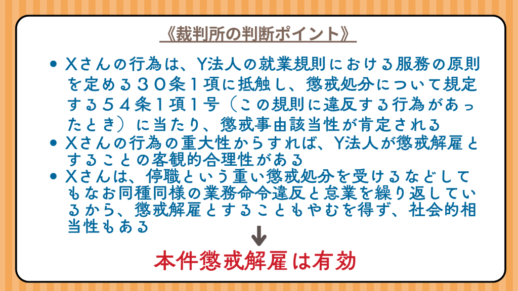 「以上によれば、Xさんの行為は、Y法人の就業規則における服務の原則を定める30条1項に抵触し、懲戒処分について規定する54条1項1号(この規則に違反する行為があったとき)に当たり、懲戒事由該当性が肯定される上、その重大性からすれば懲戒解雇とすることの客観的合理性があるといえるし、停職という重い懲戒処分を受けるなどしてもなお同種同様の業務命令違反と怠業を繰り返しているのであるから、懲戒解雇とすることもやむを得ず、社会的相当性もあるといえ、本件懲戒解雇は有効である(労働契約法15条)。」