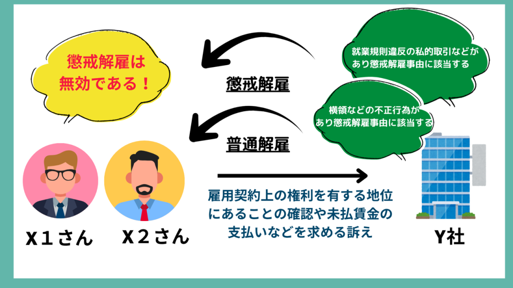 この事案は、Y社がXさんに対して行った懲戒解雇等は違法・無効であるとして、Xさんらが、Y社に対し、雇用契約上の権利を有する地位にあることの確認や未払賃金の支払いなどを求めた事案です。