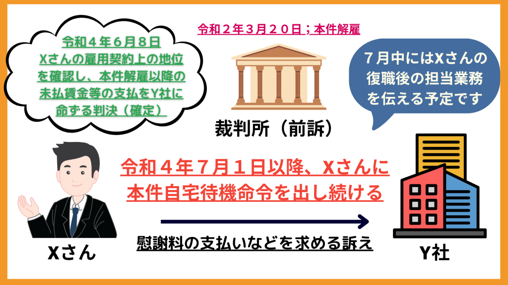 しかし、Y社は、令和4年7月1日以降、Xさんに本件自宅待機命令を出し続けている状況です。