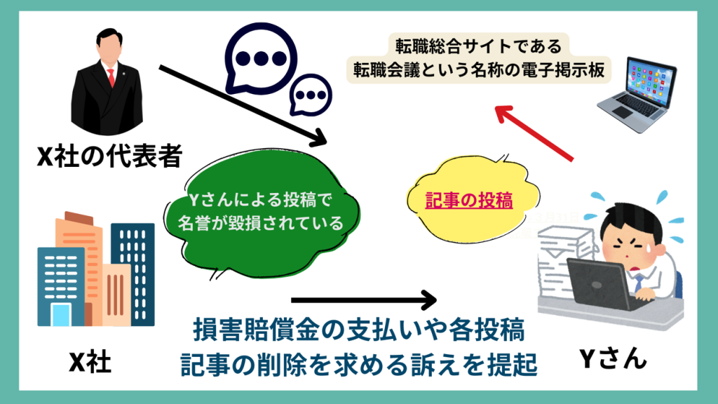 Yさんは、令和3年1月22日、株式会社A社が運営する、会社の口コミや求人情報等を掲載する転職総合サイトである転職会議という名称の電子掲示板において、X社について、本件記事1を投稿しました。