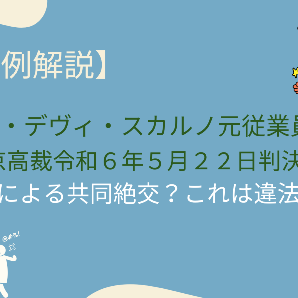 従業員らによる共同絶交は違法行為?【オフィス・デヴィ・スカルノ元従業員ら事件】 2024.03.30 「村八分」という言葉を耳にしたことはあるのではないでしょうか。村八分とは、江戸時代を中心に行われた制裁行為であり、村という共同体秩序の維持のために行われていたものであり、たとえば暴行や窃盗などの刑事事件を犯した者や村の共…
