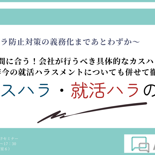 【セミナー開催のご報告】カスタマーハラスメント・就活ハラスメントの実務対応とは?【第7回一般企業向けセミナー】(終了) 2026.02.13 令和8年2月13日、カスタマーハラスメント、就活ハラスメントの実務をテーマとする企業向けセミナーを開催いたしました。 川崎の企業法務はぜひ弁護士法人ASKにご相談ください。