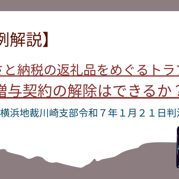 ふるさと納税の返礼品をめぐるトラブル!贈与契約の解除はできるか?【横浜地裁川崎支部令和7年1月21日判決】 2026.03.09 贈与契約とは? 民法549条では、「贈与は、当事者の一方がある財産を無償で相手方に与える意思を表示し、相手方が受諾をすることによって、その効力を生ずる。」と定められています。 たとえば、Aさんが、Bさんに対して、「私が持…